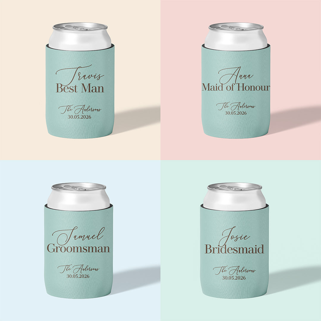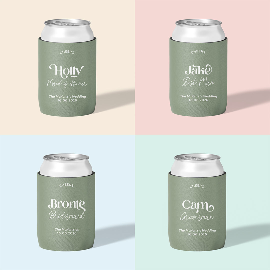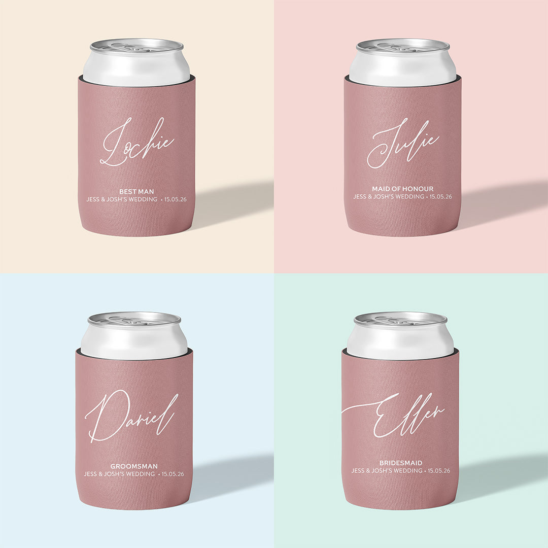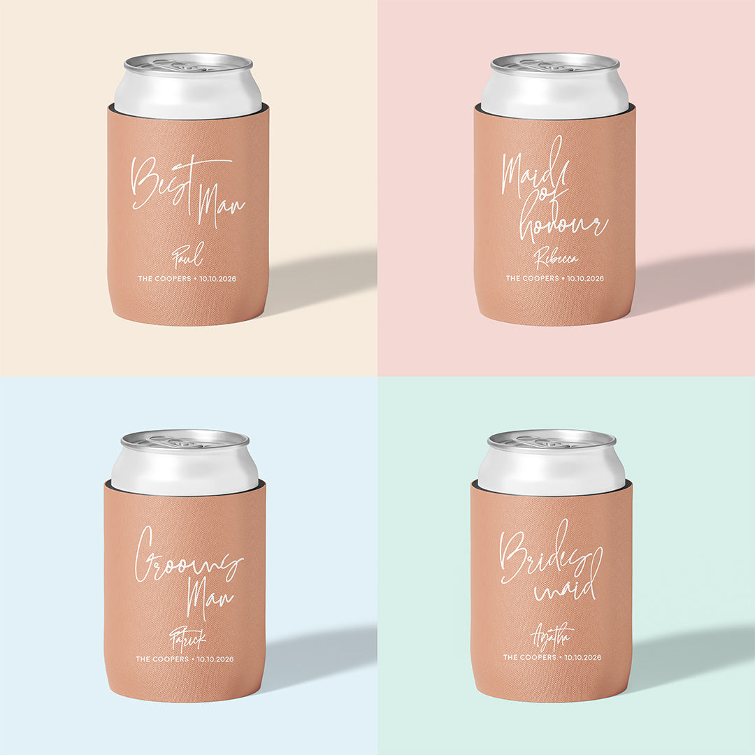 Our Wedding Party Sets make it easy: beautifully personalised stubby holders for your bridesmaids, groomsmen, and the people who’ve been there through every part of your journey. Thoughtful, practical keepsakes that feel genuinely part of your day — not just another item on the checklist.