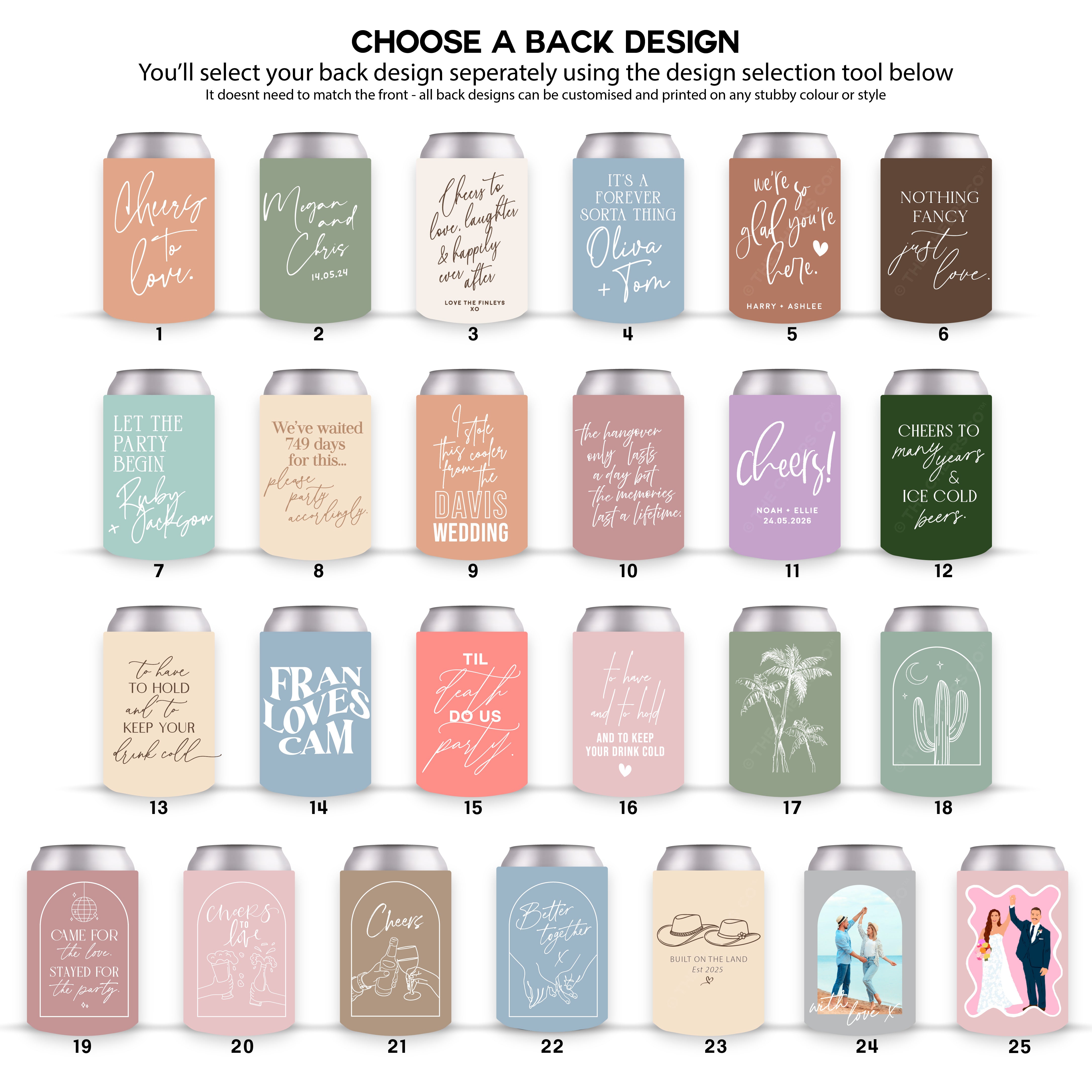 Each set includes custom stubby holders designed to match your chosen style, names and roles — making them the ideal thank-you for your bridesmaids, groomsmen and special people.